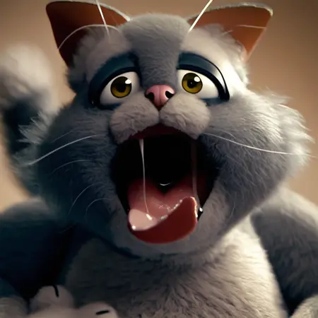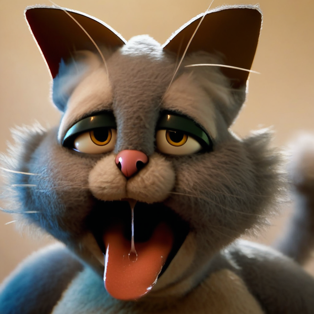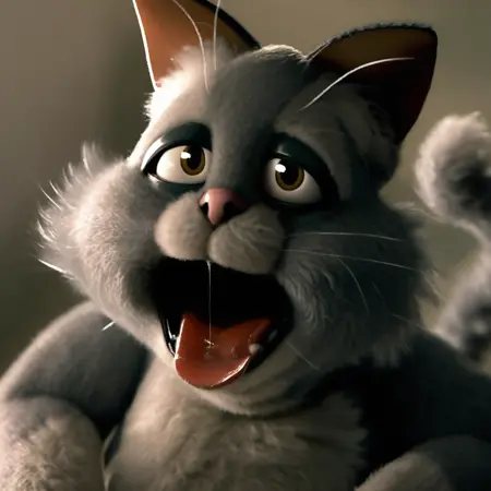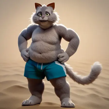 catboy, grey fur, scruffy fur, whiskers, pink nose, white snout, green eyes, cat tail, chubby,