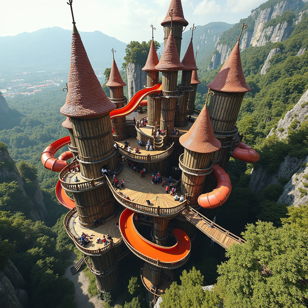 多层游乐场:高耸的结构,配备互连的攀爬墙、螺旋管式滑梯、软垫平台和绳索桥。