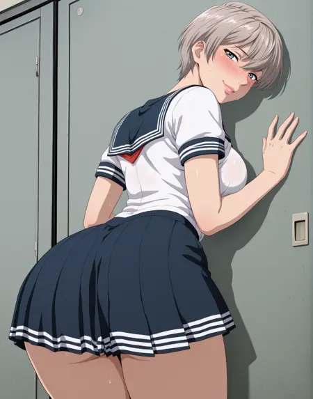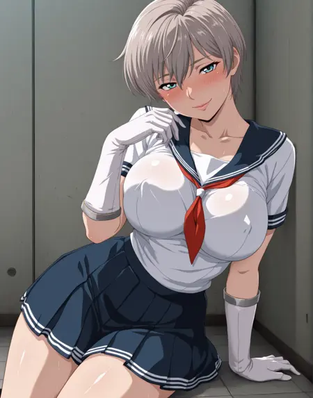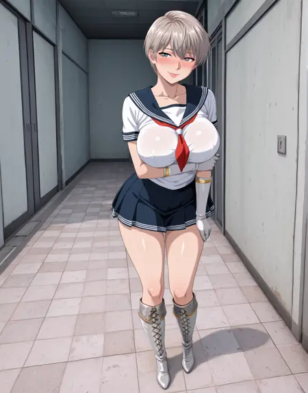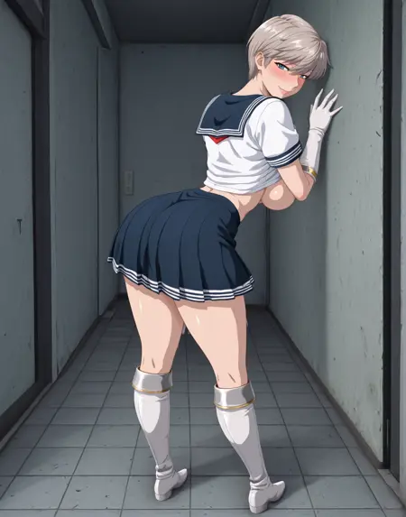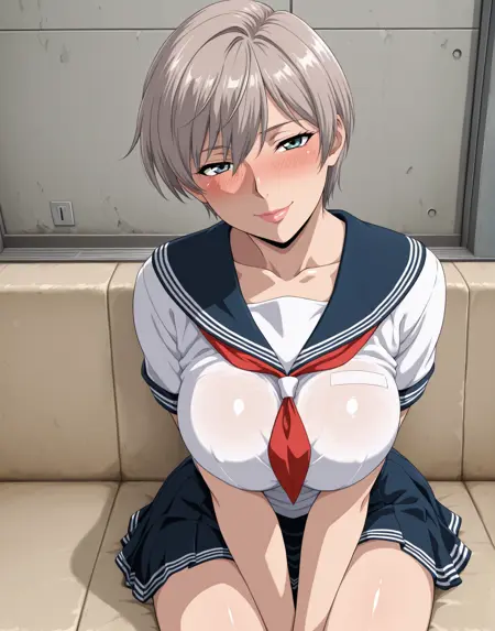 FreericSk, short hair, silver hair, uniform, serafuku, skirt, big breast, lips,