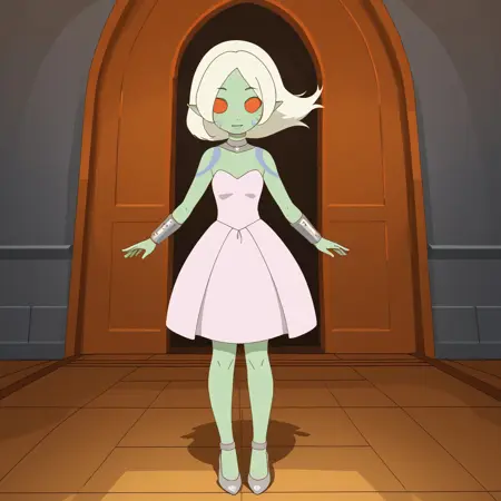 1소녀, 혼자, 흰 머리, 뾰족한 귀, 초커, 보라색 크롭탑, 배꼽, 보라색 반바지, 회색 허벅지 긴 부츠, 은색 팔찌, 어두운 주황색 눈, 동공 없음, 어두운 주황색 공막, 녹색 피부