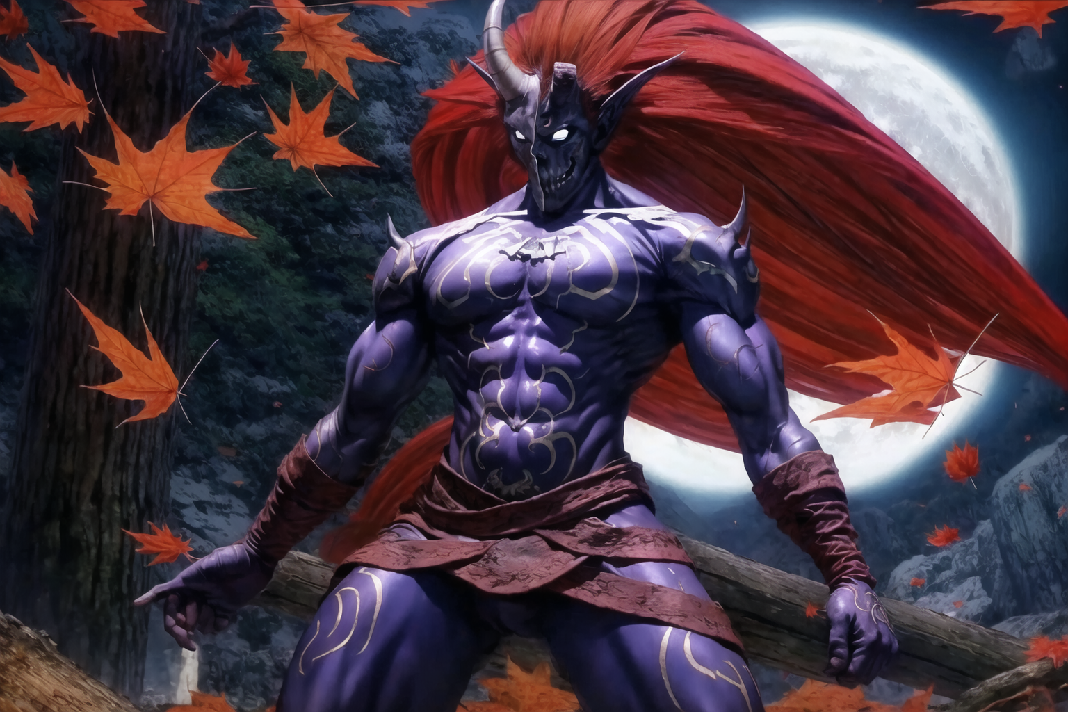 酒吞童子, crimsonking, monster, skull mask, red hair, no humans, topless male, muscular, pointy ears