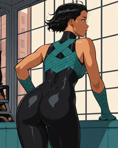 Trigger: sindc, black hair, short hair, brown eyes, bodysuit, glove