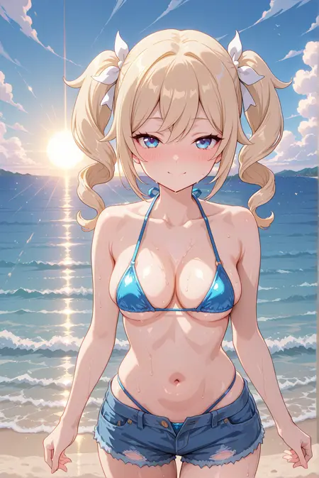 基础:bar-idol,1girl,蓝眼睛,金发,双马尾,钻头发型,白色发带