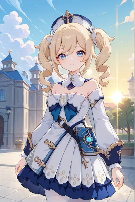 服装:bar-idol,酒吧装,1girl,蓝眼睛,金发,双马尾,钻头发型,白色发带,帽子,视觉(原神),单人,白色连衣裙,无肩带连衣裙,层叠裙摆,荷叶边连衣裙,书本,白色连裤袜,可拆卸袖子,露肩,荷叶边袖子,白色袖子,可拆卸领子,腕带,蓝白蝴蝶结,金色镶边,鞋子