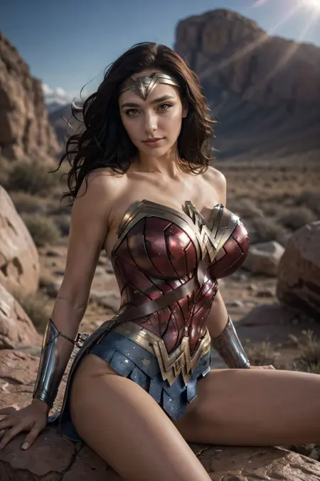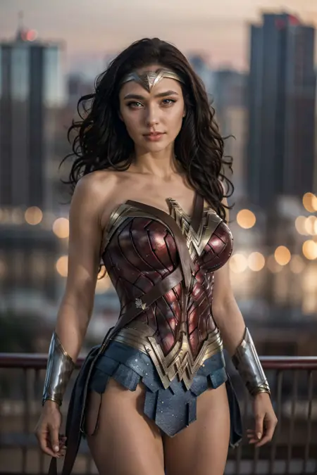 SD Positive prompt : LORA, realistic, masterpiece, realistic, detailed, 8k, 1girl, beautiful photography of wonder woman, superhero, black hair, brown eyes, huge breast, massive cleavage, eyelashes, soft makeup, big thighs, hourglass body shape, slim body,..