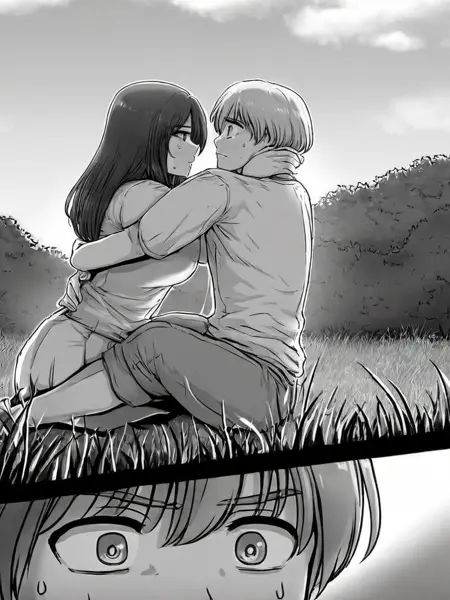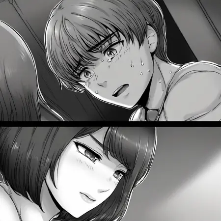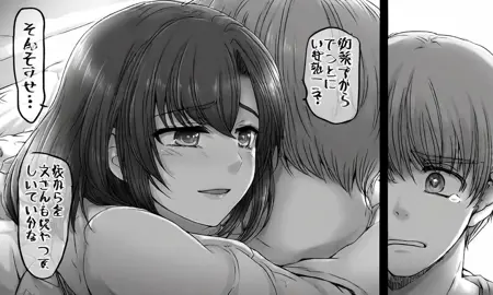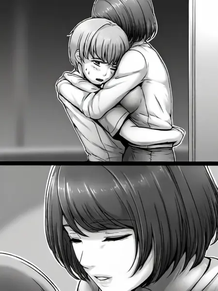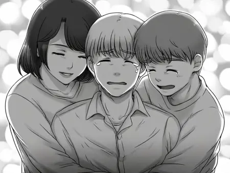 • greyscale, singleframe, 1girl, smile, short hair, shirt, closed eyes, tears, 1boy, mole, hug, happy tears, good end, group hug, affectionate, white heart-shaped background