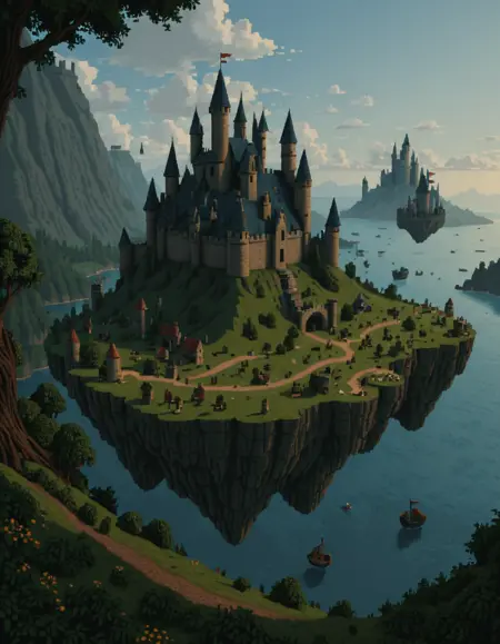 • 섬이나 하늘의 곡선 구조 위에 떠 있는 성을 생성합니다