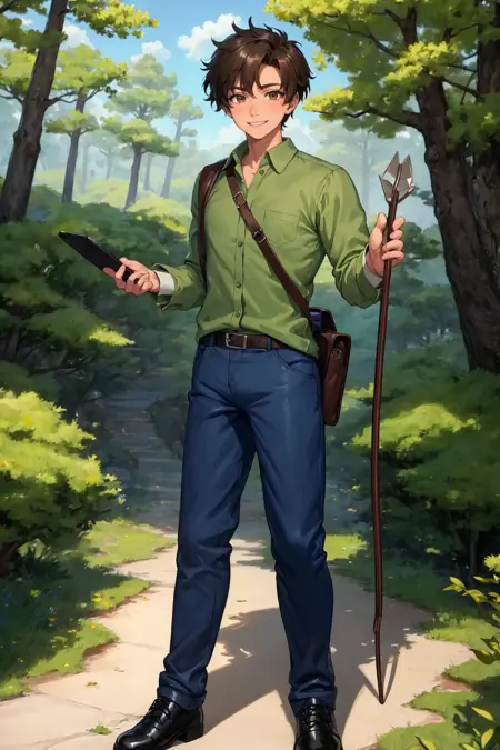For his normal outfit it's "green shirt, blue pants, black footwear"