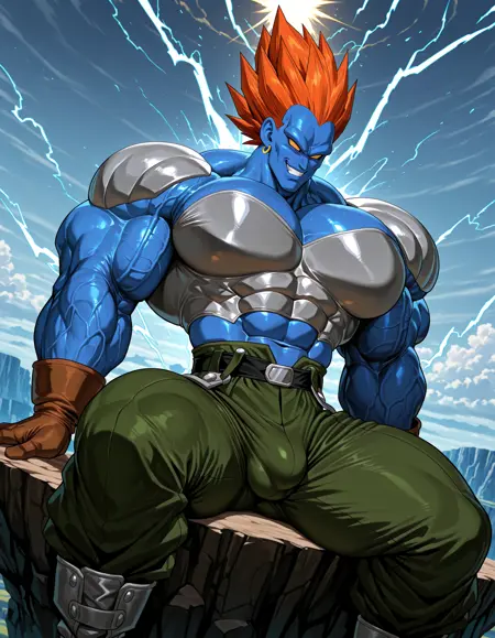 super android 13, blue skin, orange hair, orange sclera, no pupils, gold earrings, silver shoulder pads, silver breastplate, brown gloves, silver boots, green pants