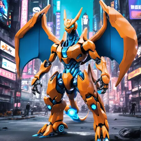 "full body shot of robot Charizard, robot pokemon, standing in a futuristic city , burning tail, cyberpunk city with neon signs in background_, HD, masterpiece, best quality, hyper detailed, ultra detailed"_