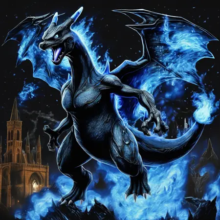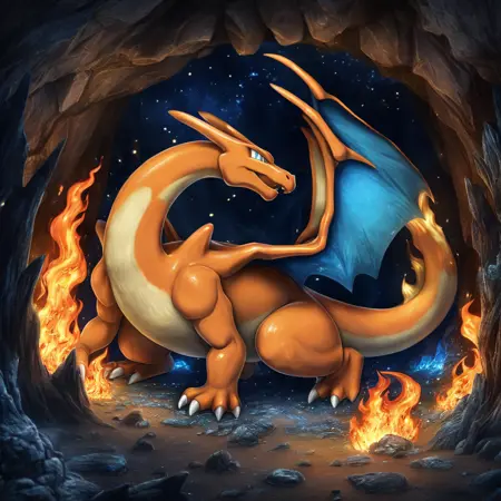 "full body shot of Charizard, sleeping in a cave, burning tail, orange and blue wings, beautiful cave with glowing mushrooms in background,HD, masterpiece, best quality, hyper detailed, ultra detailed"Recomended vae that I use is the official sdxl_vae