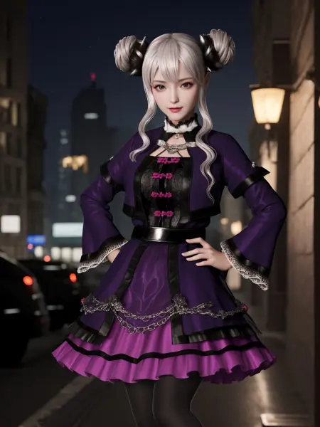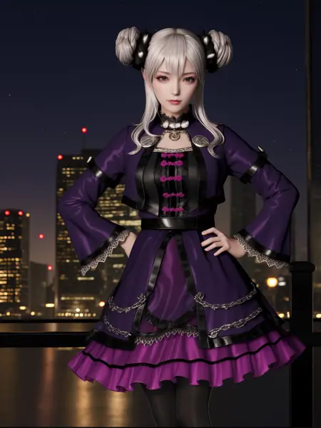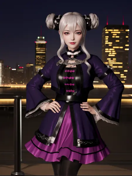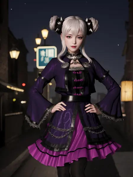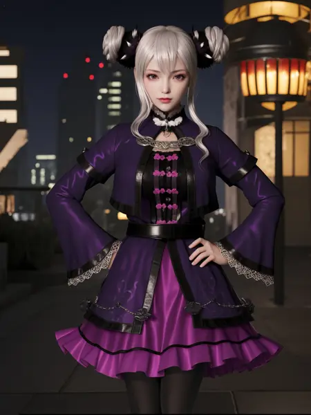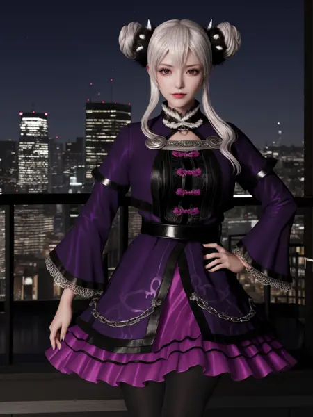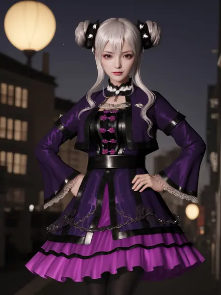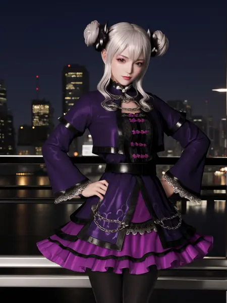 - ZSGWSdongbaiYP, 1girl, solo, double bun, dress, braid, white hair, lolita fashion, black pantyhose, jewelry, long sleeves, long hair, standing, hair ornament, looking at viewer, cityscape, night, poolside, hand on hip,