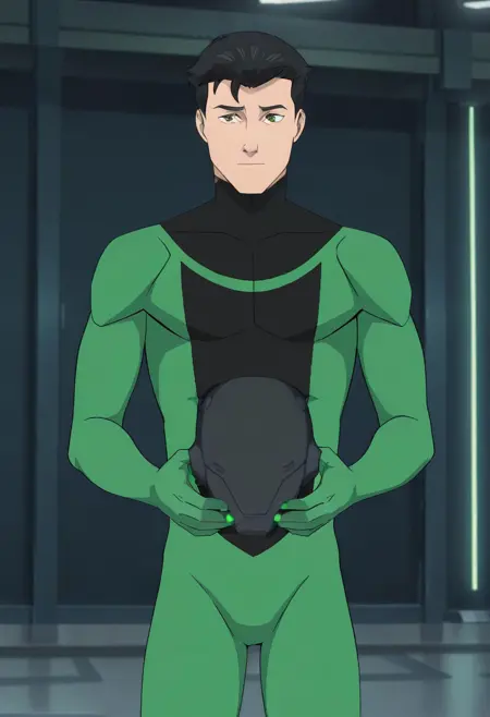 GDA Mark, GDA Invincible, black and green bodysuit, bodysuit, helmet, superhero, shoulder pads, pauldrons