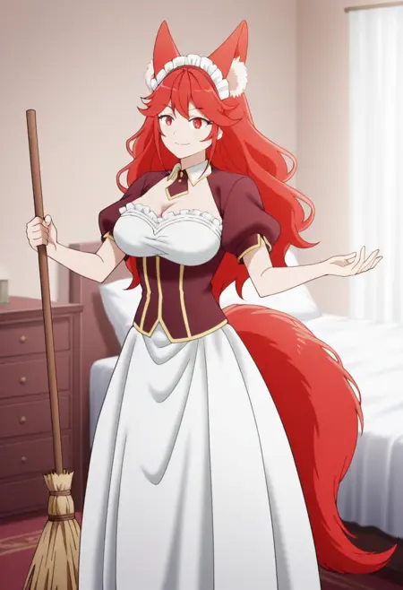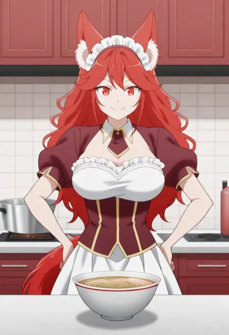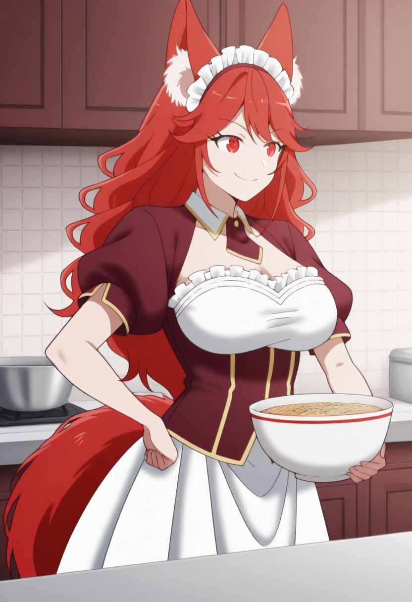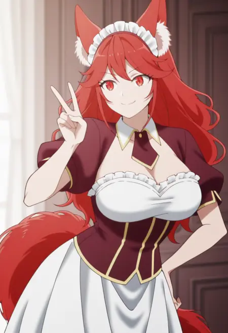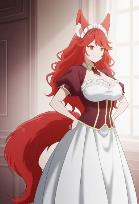 トリガー = zzflayzz、タグ = 動物の耳、長い髪、1girl、赤髪、ソロ、胸、メイドの頭飾り、オオカミの耳、尾、メイド、赤い目、動物の耳のふわふわ、オオカミの尾、大きな胸、オオカミ娘、ふわふわの袖、笑顔、ドレス