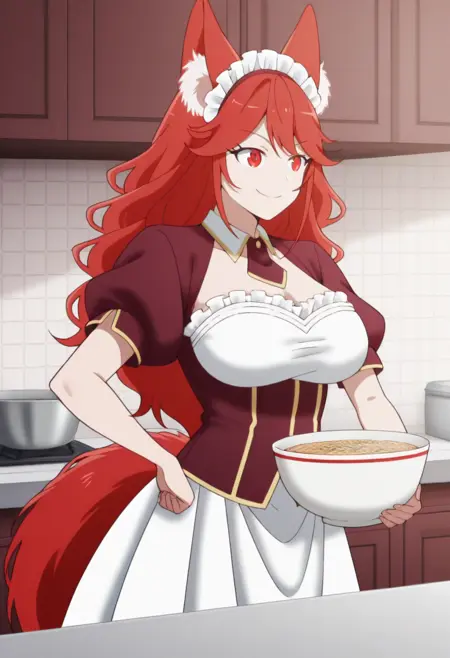 Trigger = zzflayzz, Tags = animal ears, long hair, 1girl, red hair, solo, breasts, maid headdress, wolf ears, tail, maid, red eyes, animal ear fluff, wolf tail, large breasts, wolf girl, puffy sleeves, smile, dress,