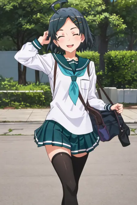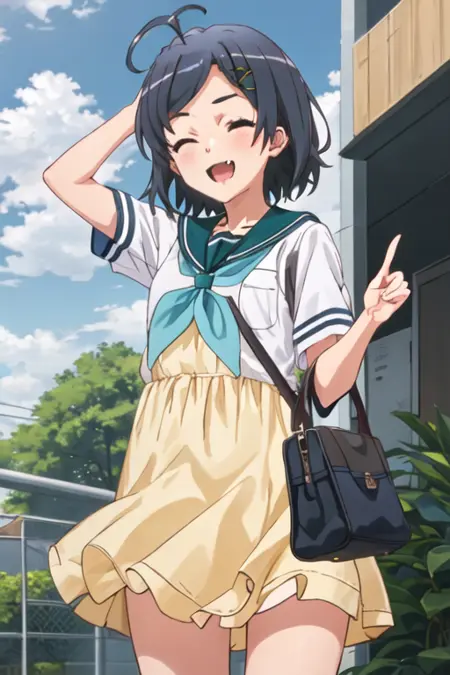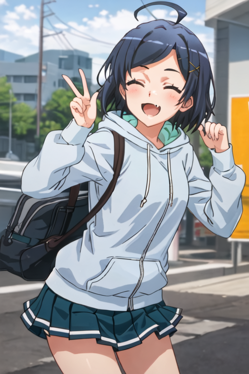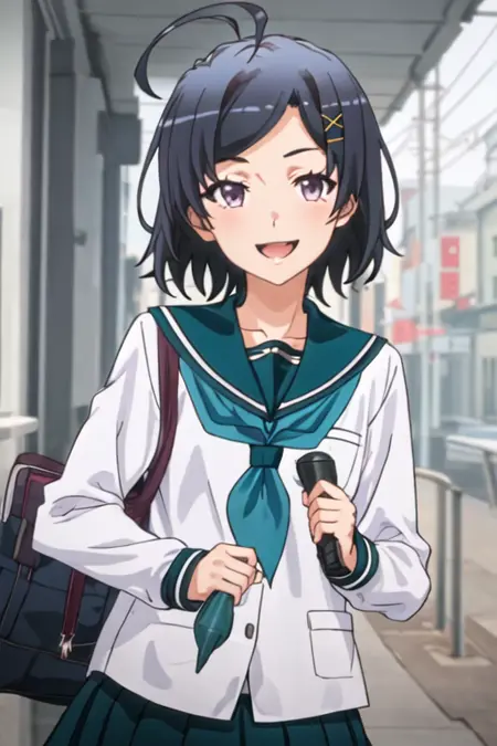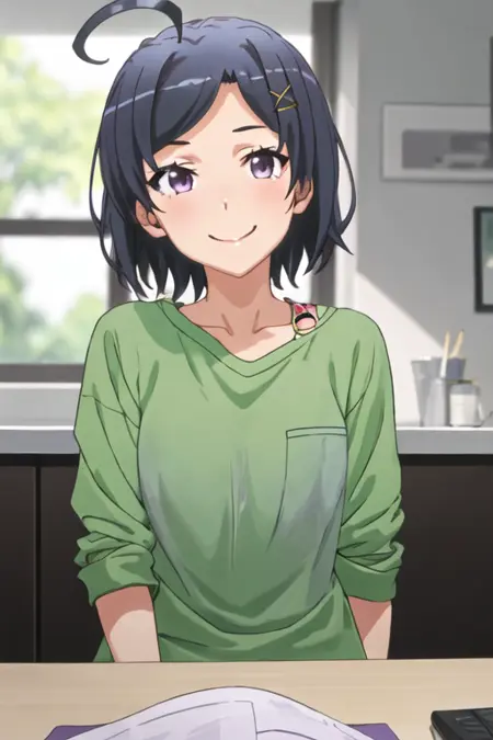 トリガー語はhikigaya_komachi_yahariorenoseishunlovecomewamachigatteiruで、推奨タグはbest quality, masterpiece, highres, solo, {hikigaya_komachi_yahariorenoseishunlovecomewamachigatteiru:1.15}, short_hair, black_hair, ahoge, hair_ornament, hairclip, smile, x_hair_ornamentです。