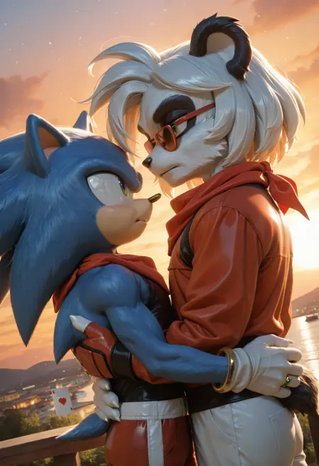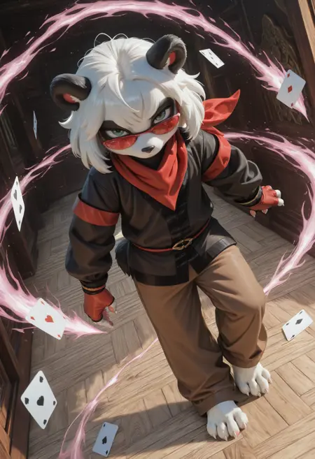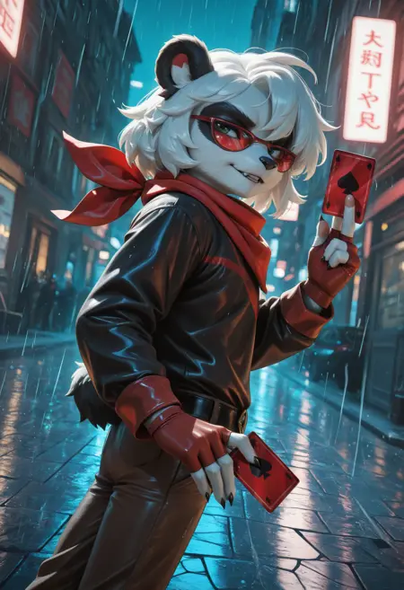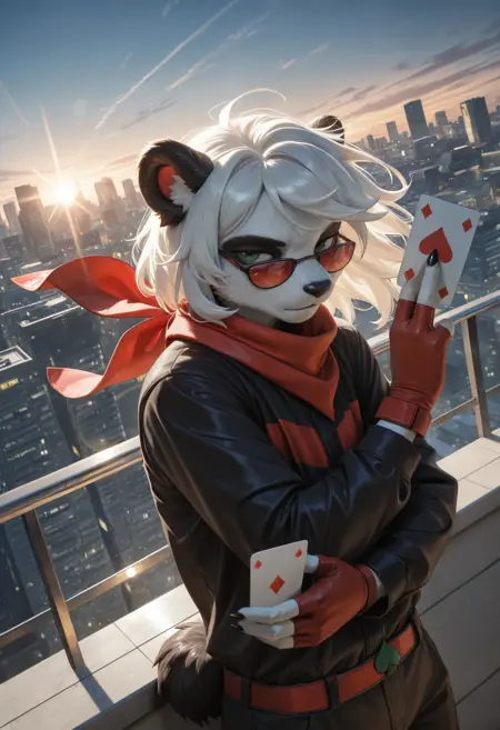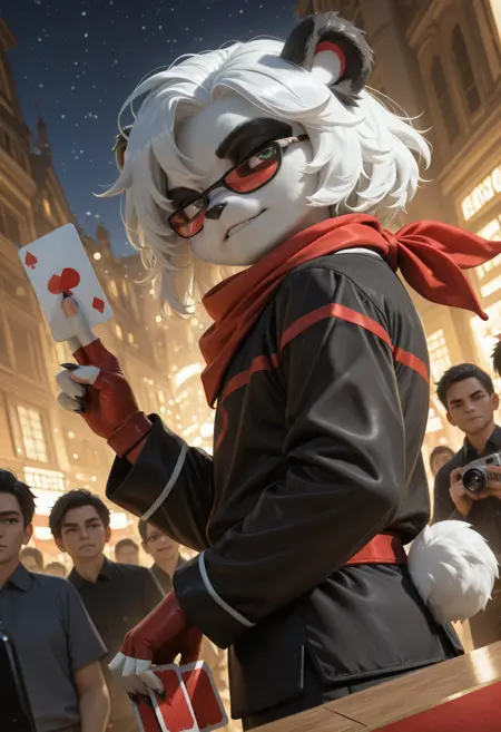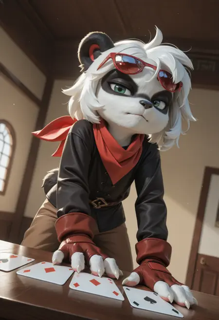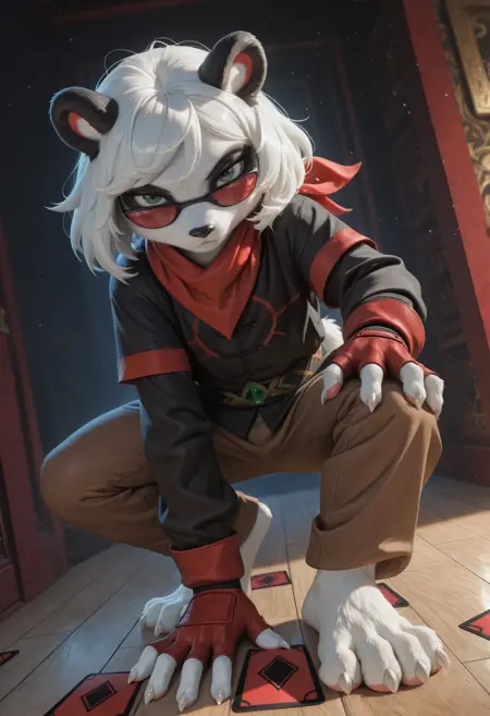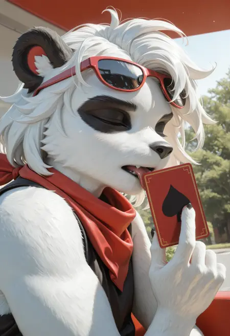 spade_fre3dom_p1anet, mammal, panda, animal ears, furry, 1boy, solo, male focus, furry male, sunglasses, tail, red fingerless gloves, bandana, claws, clothes, adult, white fur, white claws