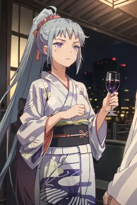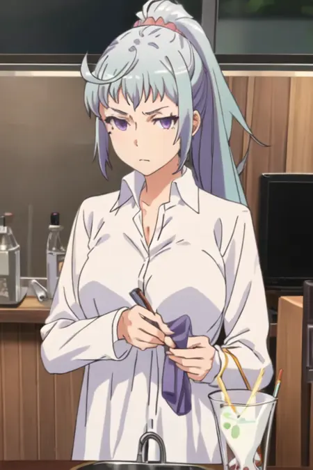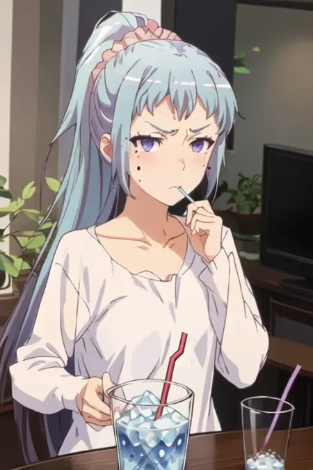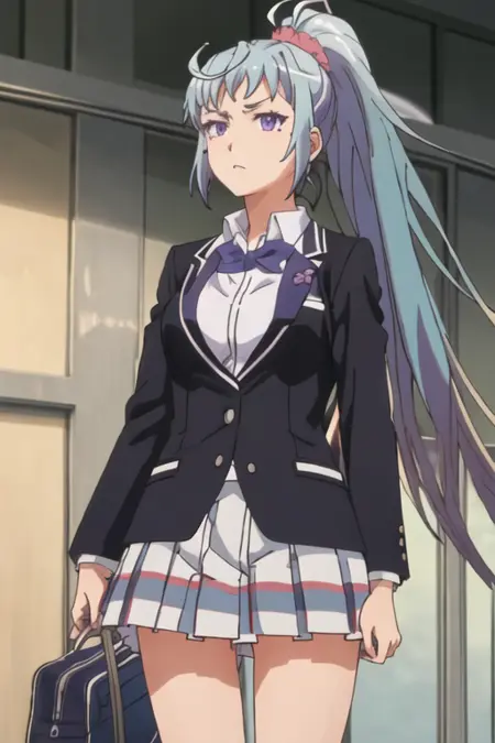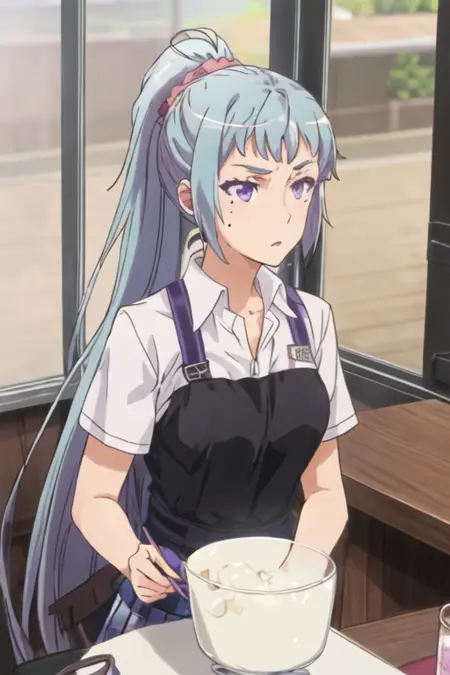 触发词为 kawasaki_saki_yahariorenoseishunlovecomewamachigatteiru,推荐标签为:best quality, masterpiece, highres, solo, {kawasaki_saki_yahariorenoseishunlovecomewamachigatteiru:1.15}, ponytail, long_hair, blue_hair, mole, mole_under_eye, purple_eyes。