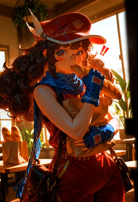 jewelry, semi-rimless eyewear, red and white headwear, hat feather, hat ornament, red shirt, sleeveless, vest, official alternate costume, blue scarf, red pants, baggy pants, shoulder bag, blue gloves, fingerless gloves, brown footwear, boots,