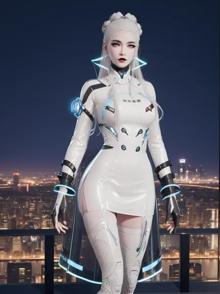 - YJWJguqinghanSNX, 1girl, solo, white hair, long hair, blue eyes, breasts, jewelry, lips, makeup, see-through, dress, science fiction, hair ornament, gloves, long sleeves, thigh boots, cityscape, night, looking at viewer, mature female, hand on hip,