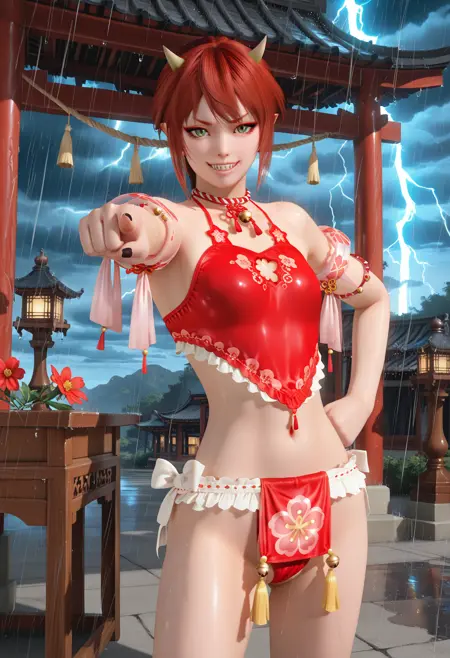 角色:Kanna \(DOA\),1girl,鬼族,红发,鬼角,V形眉毛,红眉,绿眼,竖瞳,黑睫毛,红色眼线,尖耳,