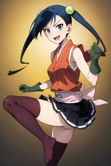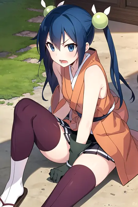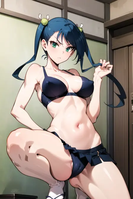 ツインテール、青髪、手袋、髪飾り、髪の飾り、長髪、緑の目、黒髪、和服