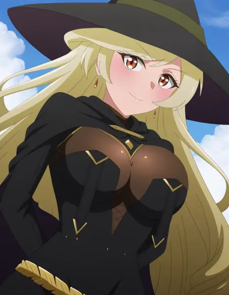 witch hat, earrings, black cape, black dress, bodystocking, see-through cleavage, cross-laced cutout, long sleeves, fingerless gloves, loose belt, pelvic curtain, bare legs