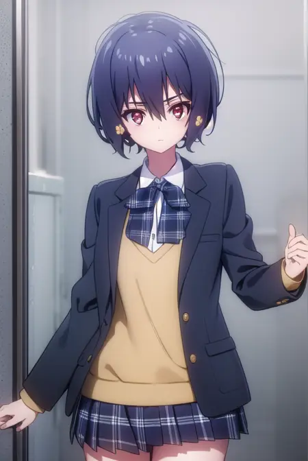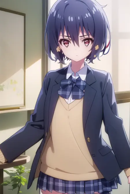 검은 자켓, 검은 하의, 검은 목착, 검은 치마, 블레이저, 갈색 신발, 칼라 셔츠, 꽃, 머리에 꽃, 머리장식, 자켓, 로퍼, 긴 소매, 미니 치마, 열린 옷, 열린 자켓, 체크무늬, 체크무늬 목착, 체크무늬 치마, 주름 치마, 학교 유니폼, 셔츠, 신발, 치마, 스웨터, 흰 셔츠, 윙 칼라, 노란 꽃, 노란 스웨터