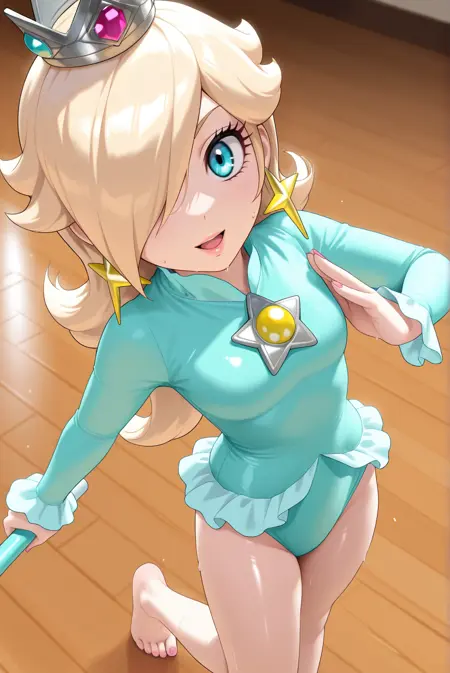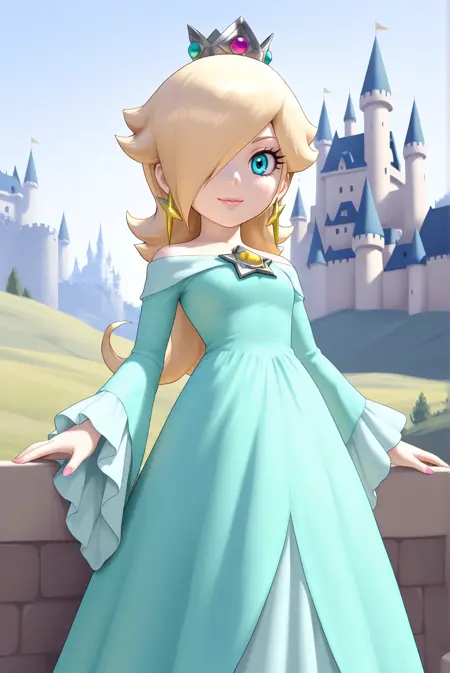 <lora:Rosalina-IL-v1-07:1.0>, ChopioRosalina, 노란 머리, 긴 머리, 곱슬 머리, 한쪽 눈 위의 머리, 파란 눈, 입술, 속눈썹, 귀걸이, 분홍색 손톱, 시청자 바라보기,