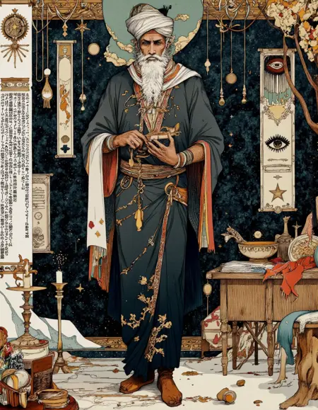아키야 카게이치는 '골든 그레이블'로도 알려진 일본의 일러스트레이터로, 복잡하고 창의적인 작품으로 유명합니다. 그의 작품은 보통 달과 같은 신비로운 기호들이 가득한 혼란스럽고 역동적인 장면으로 구성되며, 이는 어두운 초자연적 힘의 영향을 암시합니다. 카게이치의 작품은 변형의 특성을 지니고 있어, 물체와 캐릭터가 단일 평면 내에서 변형되며 숨겨진 지하 세계와 비밀스러운 미래를 드러냅니다. 그의 예술은 마법, 술법, 이야기를 결합하여 환상과 신비로운 요소를 융합한 세계로 관객을 초대합니다.