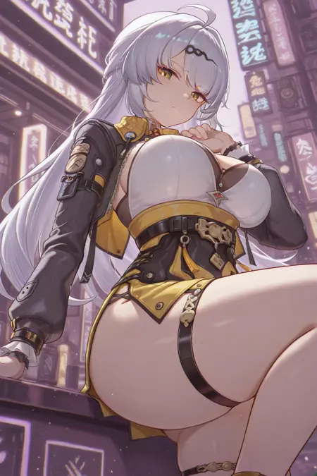yixuan \(zenless zone zero\), 1girl, white hair, yellow eyes, solo, hair ornament, gloves, long hair, fingerless gloves, thighhighs, black gloves, shorts, black shorts, single thighhigh, black thighhighs, thigh strap, shirt, jacket, white shirt