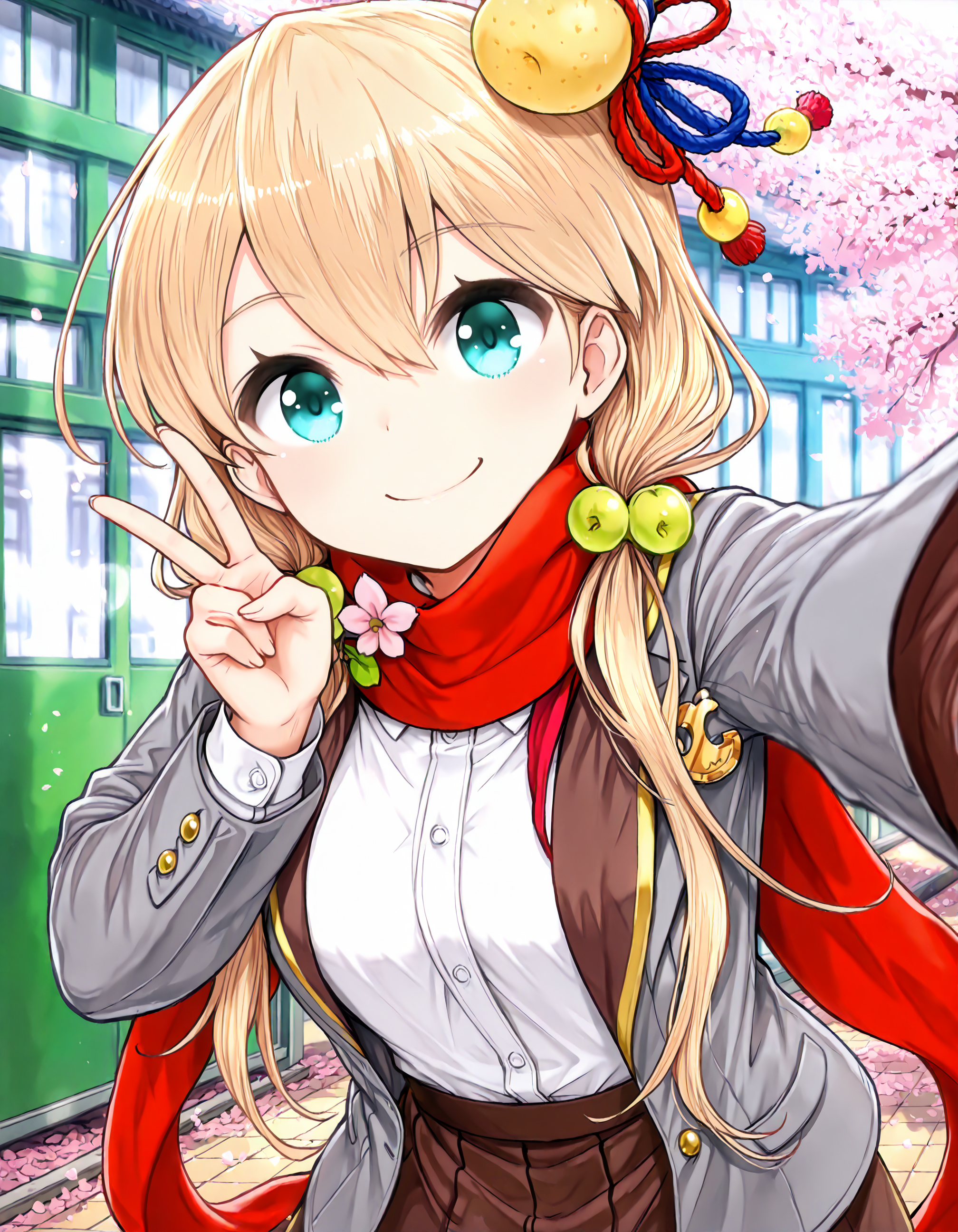 目の間の髪、低いツインテール、スカーフ、制服、グレーのジャケット、白いシャツ、茶色のスカート