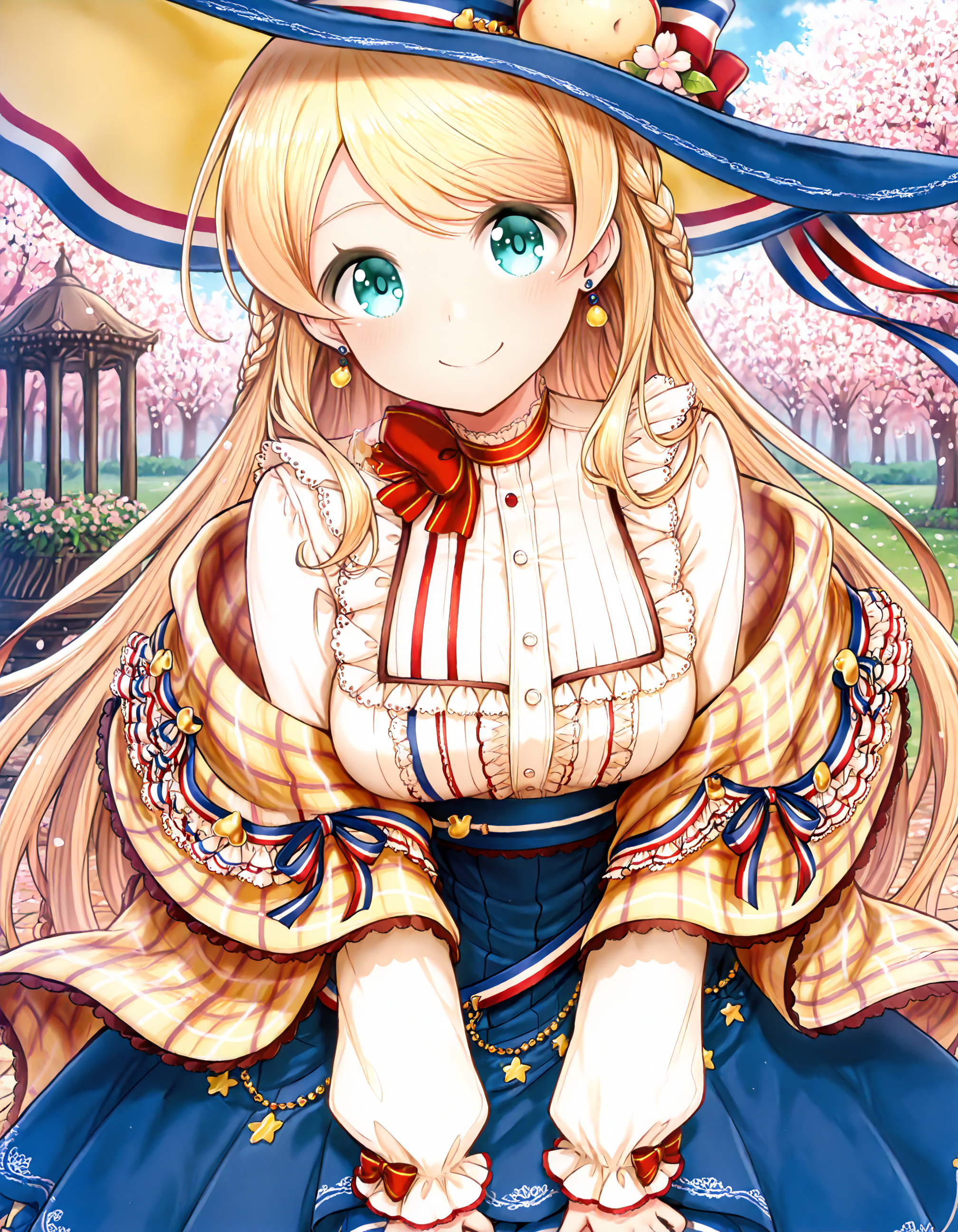 流れた前髪、編み髪、帽子、星型のイヤリング、ネックリボン、フリル付きシャツ、長袖、チェック柄のショール、青いスカート