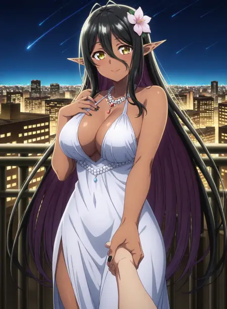 mariabellewz, dark elf,dark-skinned_female, pointy ears, very long hair, black hair, yellow eyes, large breasts, aran sweater, white sweater, turtleneck, long sleeves, black nails