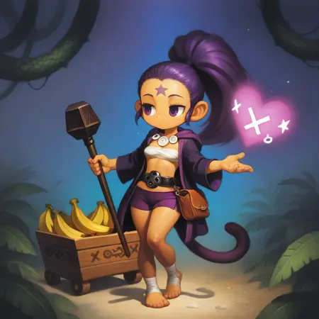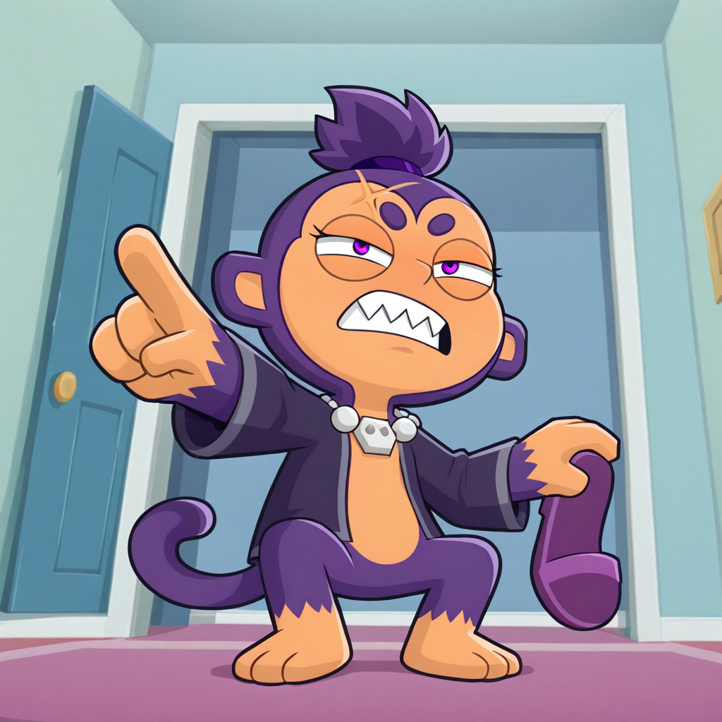 基本プロンプト:1girl、solo、3zl、monkey girl、tail、two-tone skin、top knot、purple eyes、forehead mark、robe、frown、necklace、