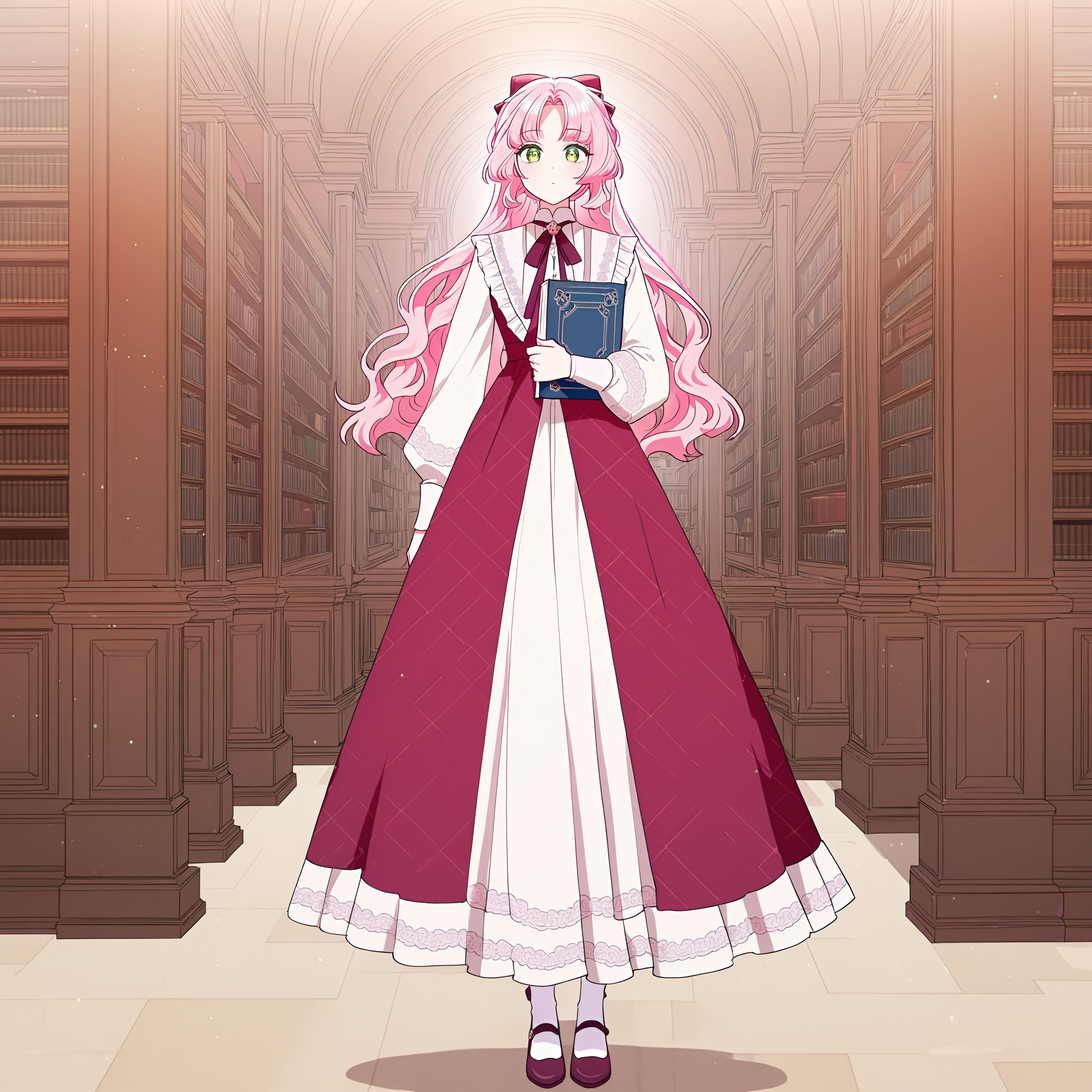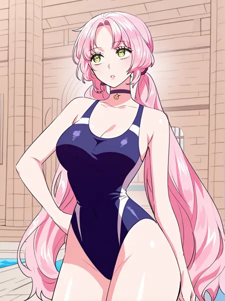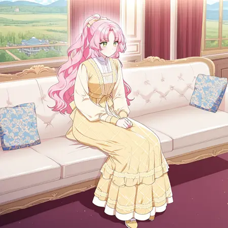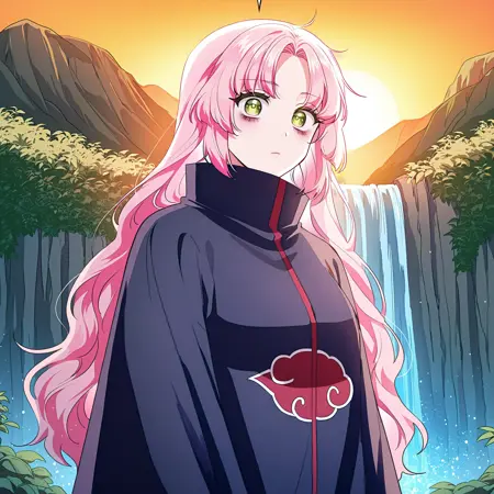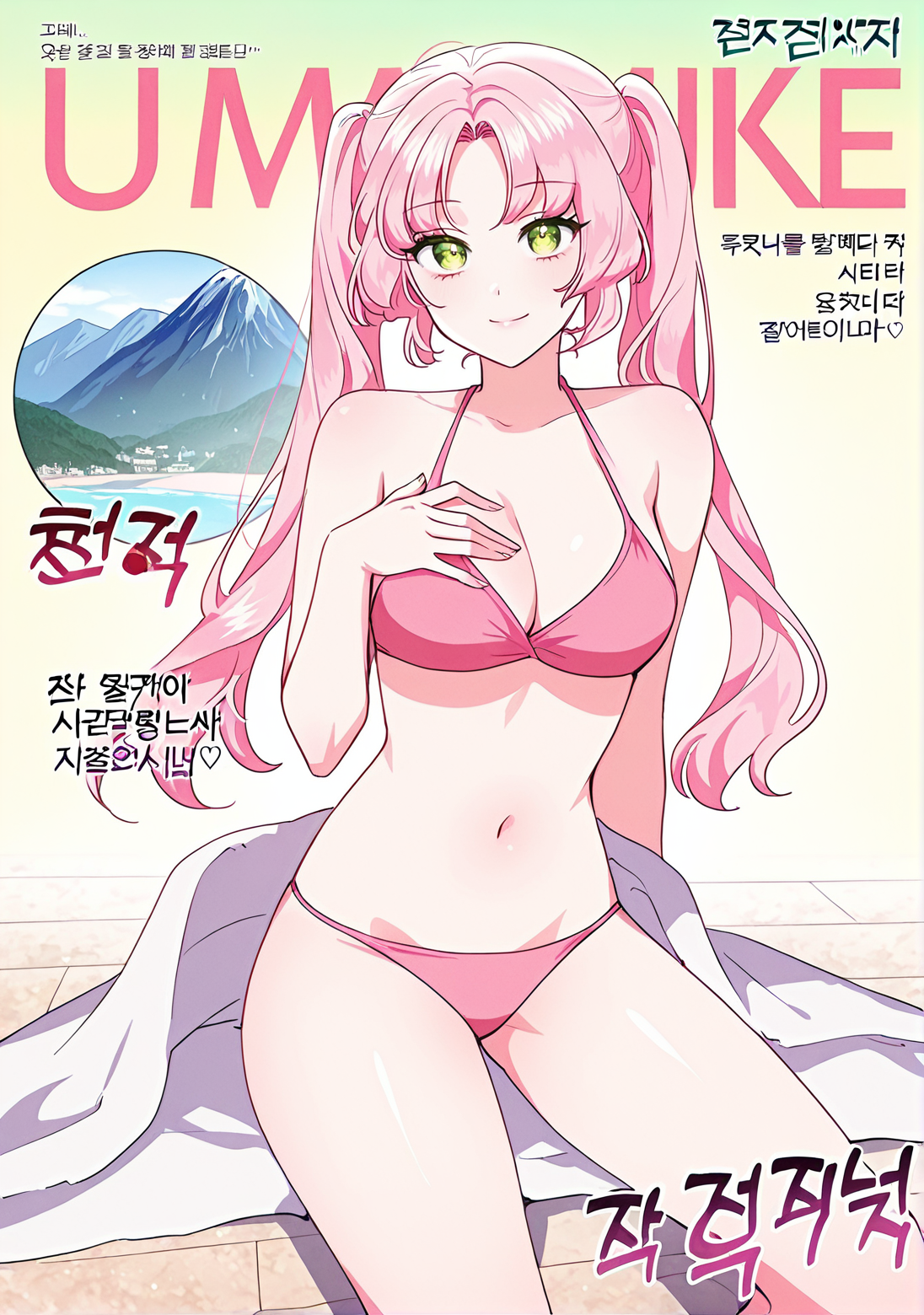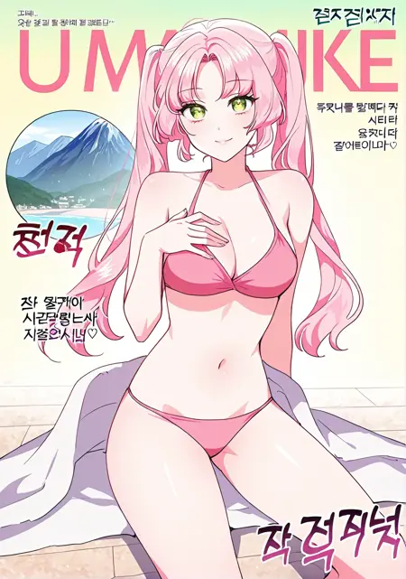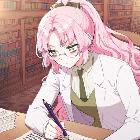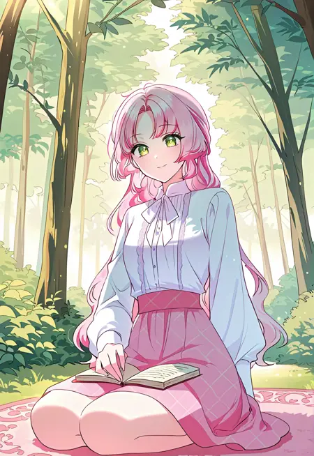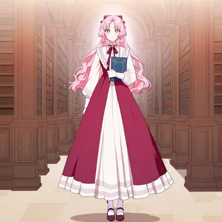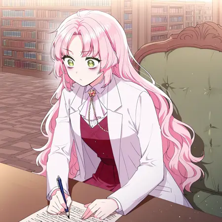 주 프롬프트: frellai, 분홍색 머리, 에메랄드 눈, 긴 머리, 앞머리