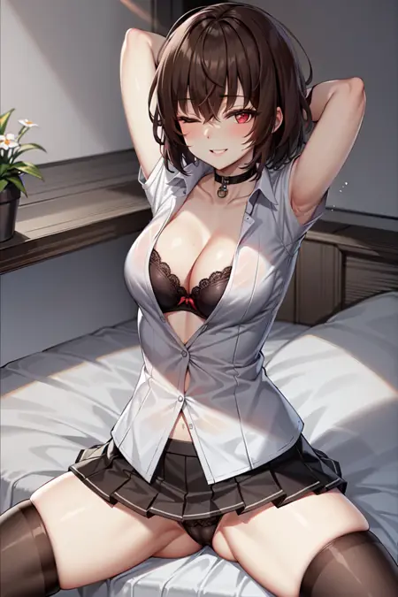 タグ:武器、スカート、チョーカー、ソロ、胸、プリーツスカート、片目を閉じる、赤い目、持っている、剣、ショートヘア、茶髪、谷間、ジャケット、武器を持つ、ファーリム、手袋、シャツ、空、ブラックスカート、bras、黒手袋、ネクタイ、中くらいの胸、スタッフ、口をちょっと開けている、ブラックチョーカー、笑顔、青空、カウボーイショット、バングス、