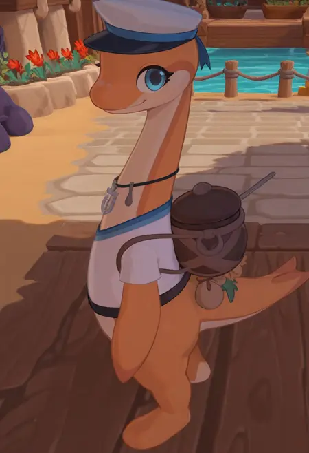 珊瑚是一只古怪的蛇颈龙,经营着往返安伯岛的渡轮服务,她更喜欢在开阔的海洋中生活,而不愿长期停留在一个地方!珊瑚一生热爱汤品,她从一个港口航行到另一个港口,寻找最佳的食材。她从旅途中汲取灵感,创造出属于自己的新食谱,其中一些可能过于奇特,不适合“粗犷的味蕾”。她还坚持认为,自己能通过汤来读取命运:根据喝汤的方式,香草和叶子会在空碗底部呈现出不同的形状,从中可以推断出关键的水手洞察与智慧。