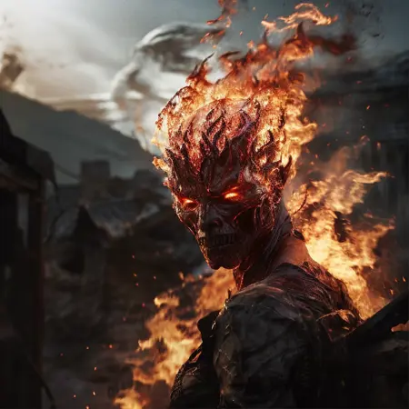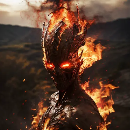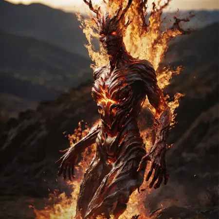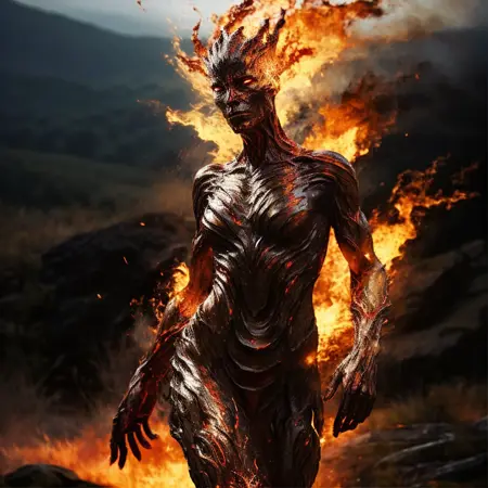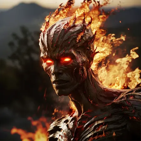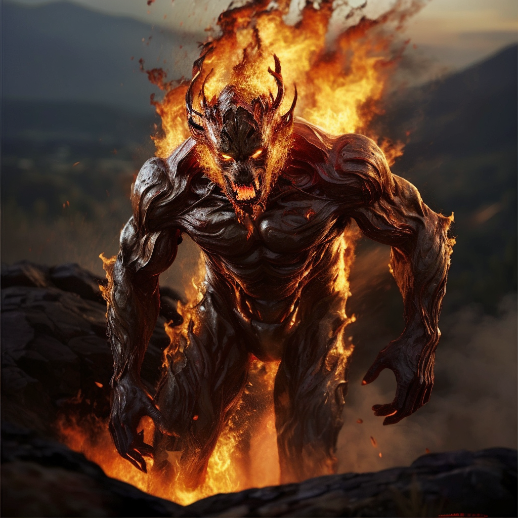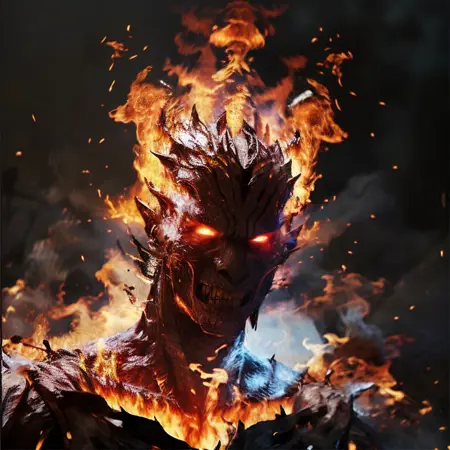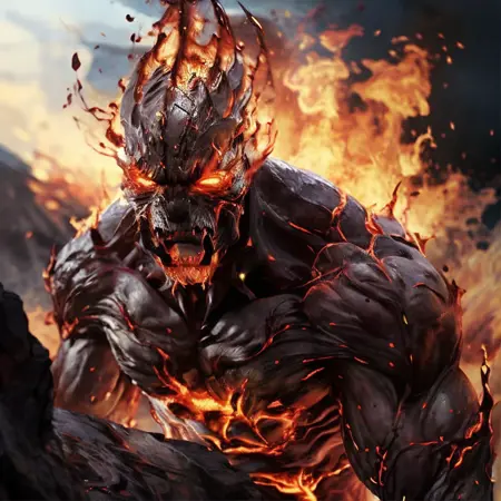 1boy, 1girl, blurry, blurry background, breasts, breathing fire, burning, claws, crown, embers, fiery hair, fire elemental, full body, glowing, glowing eyes, grin, horns, looking at viewer, molten rock, muscular, no pupils, open mouth, orange eyes, red eyes, red hair, smile, solo, spikes, standing, teeth, upper body, white eyes,