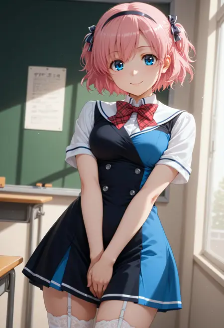 S4ciSch,蓝色眼睛,粉色头发,短发,两侧上梳,发带,发箍,不对称连衣裙,双色连衣裙,蓝色连衣裙,黑色连衣裙,双排扣,红色蝴蝶结,格子蝴蝶结,水手领,短袖,白色袖子,白色大腿袜,白色吊袜带