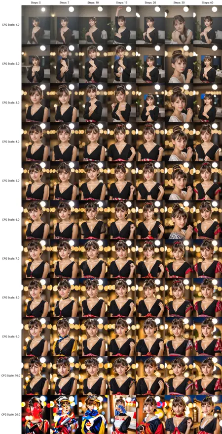 버전 9는 작동하기 시작하는 데 필요한 스텝이 적습니다. 4스텝부터 시작하는 것을 권장합니다. 더 높은 스텝을 사용하면 이미지 품질이 더 향상됩니다. 아래 테스트에서는 3–16스텝, 1–7CFG 범위를 시도했습니다. 결과를 보면, 스텝 수가 많을수록 더 높거나 낮은 CFG도 가능합니다.