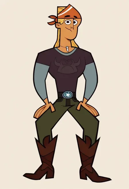 RockTDRR, 1boy, long blond hair, orange bandana, dark purple t-shirt, long sleeves, dark beige-green pants, belt, brown cowboy boots, black eyes,