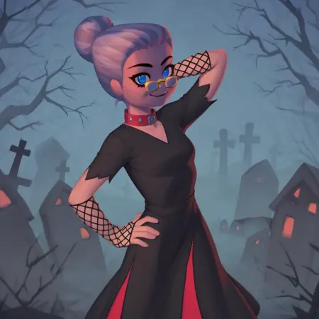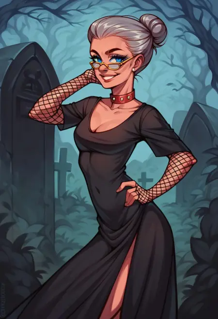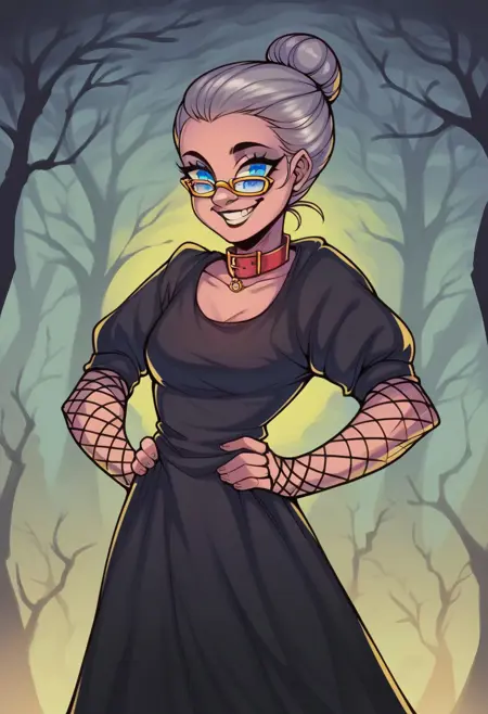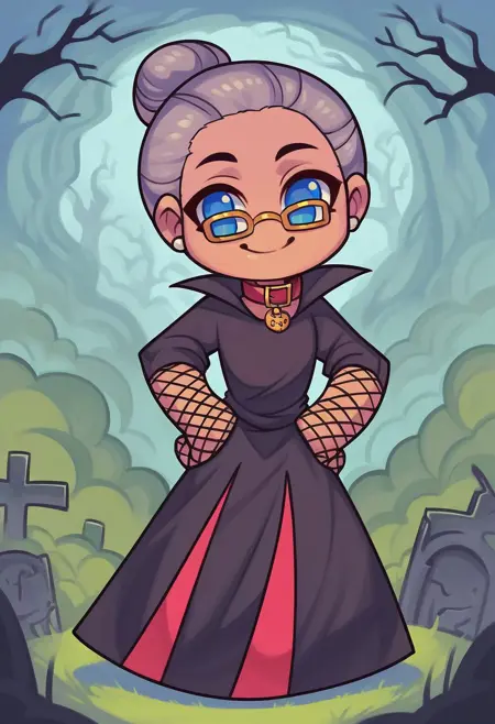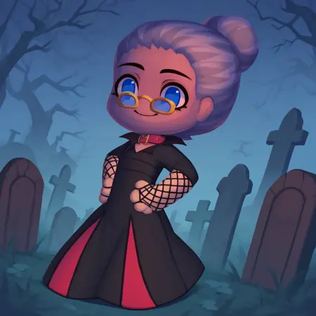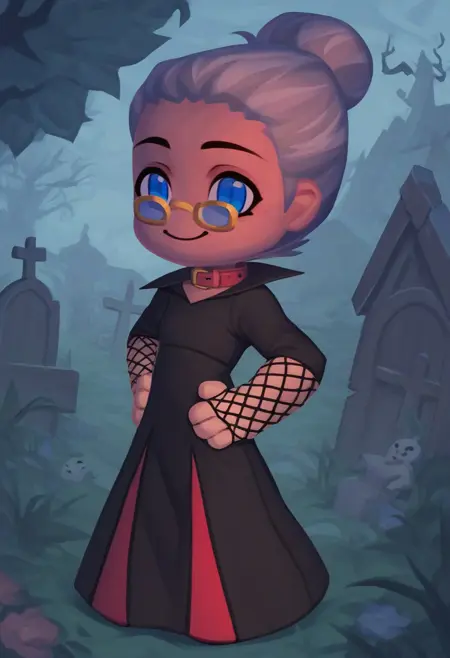 标签:"GG_Ruthie, 老妇人, 黑色连衣裙, 灰色头发, 黄框眼镜, 单发髻, 蓝眼睛, 网状手套, 红色领子"。和我其他《我的模拟人生》Lora一样,使用"chibi"表示游戏内形象,正向提示中加入"adult",负向提示中加入"child",有助于达到正确效果。