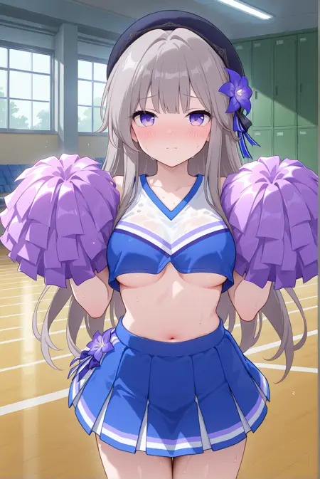 Basic: mini-hert, 1girl, grey hair, purple eyes, beret, long hair, hair flower