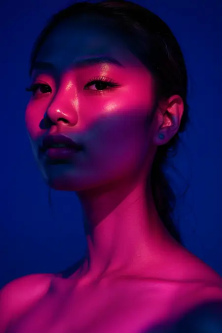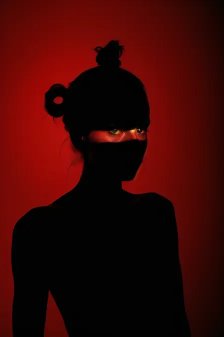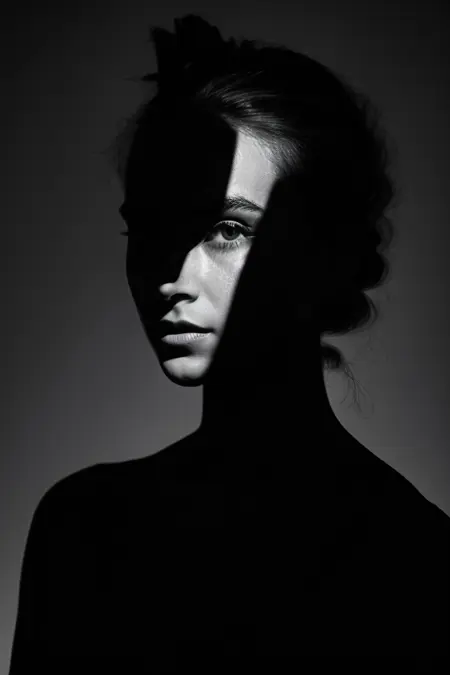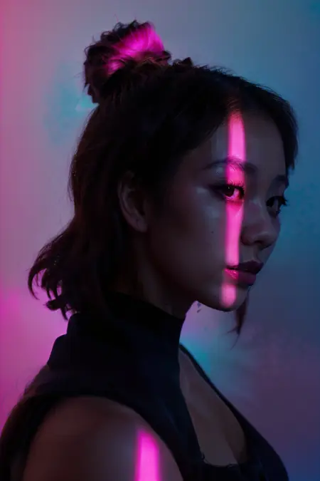 1girl,spotlight,silhouette,portrait,parted lips,closed eyes,beautiful detailed skin,one hair bun,turtleneck_sweater,dark background,lora:spotlight:0.84,