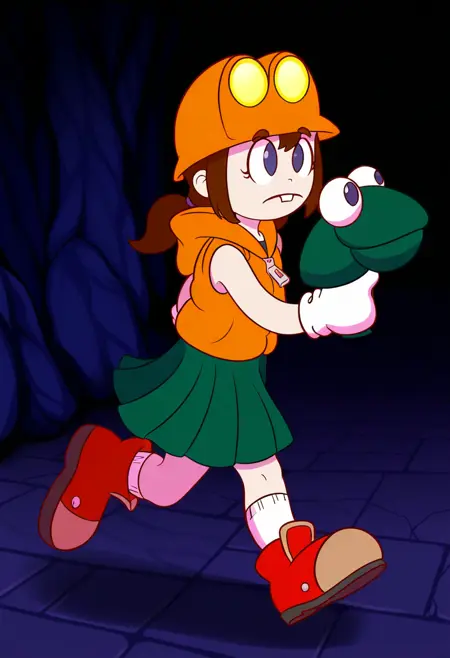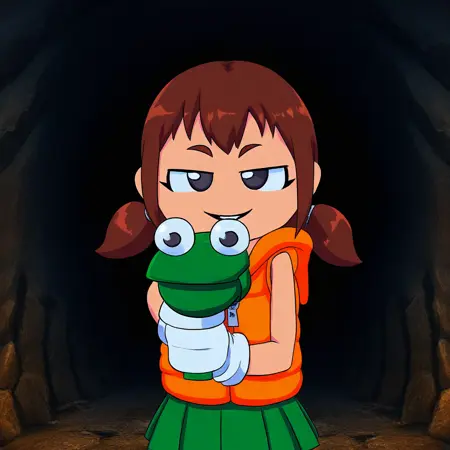 Head: Renata_MFG, brown hair, short twintails, sidelocks, buck teeth, hard hat, headlamp, orange headwear, hooded vest, orange vest, zipper pull tab, green skirt, pleated skirt, white gloves, white socks, red footwear, high tops,
