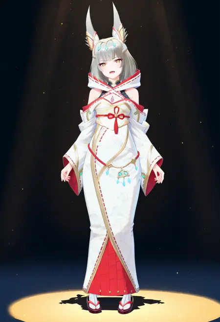 • 女王、多色和服、白色袜子、兜帽、腰带、草履