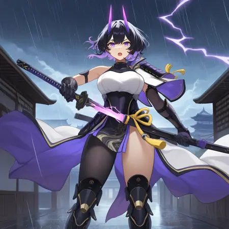 TsukAG, Tsk_Shn, short hair, black hair, purple eyes, single leg pantyhose, japanese armor, asymmetrical clothes, black pantyhose, thigh boots, purple horns, asymmetrical legwear, black footwear, mechanical boots, pelvic curtain, japanese clothes, horns, purple trim, shoulder cape, white cape, sleeveless shirt, rope around waist, yellow rope, white shirt, black gorget, black corset, corset, armpit cutout, clothing cutout, black sleeves, single sleeve, black gauntlets, single pauldron, waist cape,