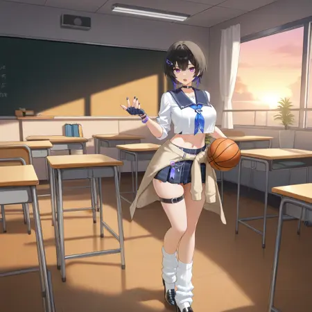 TsukAG, Tsk_Sch, short hair, black hair, purple eyes, crop top, sailor collar, blue neckerchief, white shirt, sailor shirt, rolled up sleeves, white sleeves, single fingerless glove, dark blue gloves, dark blue skirt, plaid skirt, pleated skirt, clothes around waist, sweater around waist, light brown sweater, thigh belt, baggy socks, ribbed socks, white socks, high heels, black loafers, pin, midriff, navel, black choker, hairclip, bracelet,