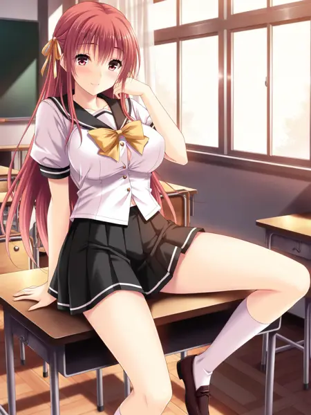 교복, 흰 셔츠, 짧은 소매, 검은 치마, 주름 치마, 미니 치마, 노란 리본 넥타이, 해적 칼라, 갈색 로퍼, 흰 무릎 양말,